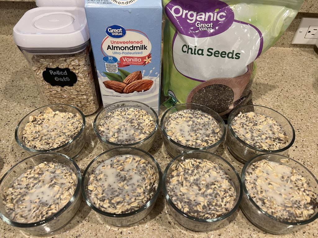 I keep my overnight oats base simple and plant-based with three simple ingredients. Then, I refrigerate them (usually in batches of 8).
